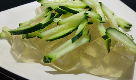 海涼粉1.8kg(10g特斯特海涼粉專用粉溶于1.8kg飲用水中制備得到)、黃瓜絲 0.5kg、大蒜泥 0.2kg、食用鹽 0.02kg、其它調味料(白砂糖、味精、芝麻醬、香油、麻辣紅油、香菜)根據個人口味適量添加。
